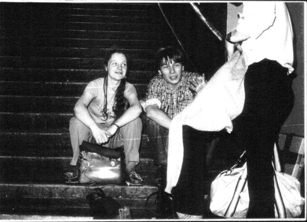 Studencki Festiwal Piosenki w Krakowie. Schody w Klubie "Rotunda" . Ruda (M. Grodzińska) i jej mały magnetofon reporterski (ależ to było ciężkie!)